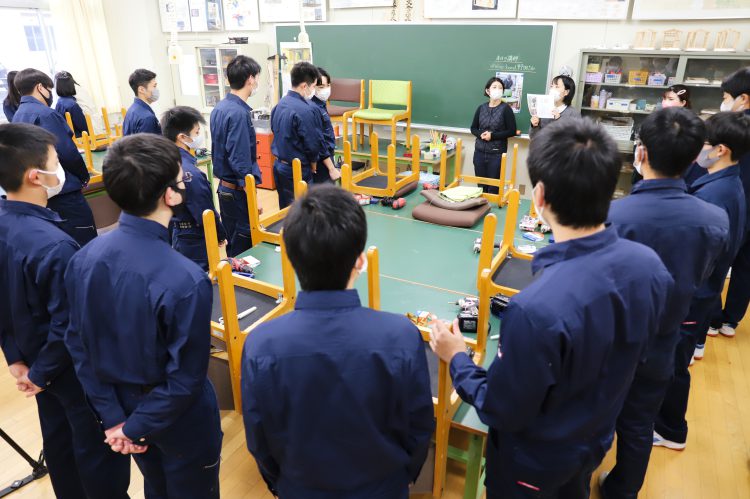 完成した椅子は、生徒たちが富士小学校の児童会の皆さんにお届けし、現在も富士小学校の児童たちが大切に使っています。